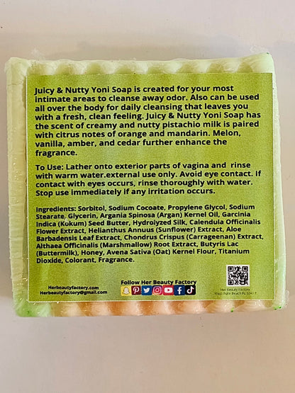 Juicy & Nutty Yoni Soap is created for your most intimate areas to cleanse away odor. Also can be used all over the body for daily cleansing that leaves you with a fresh, clean feeling. Juicy & Nutty Yoni Soap has the scent of creamy and nutty pistachio milk is paired with citrus notes of orange and mandarin. Melon, vanilla, amber, and cedar further enhance the fragrance.